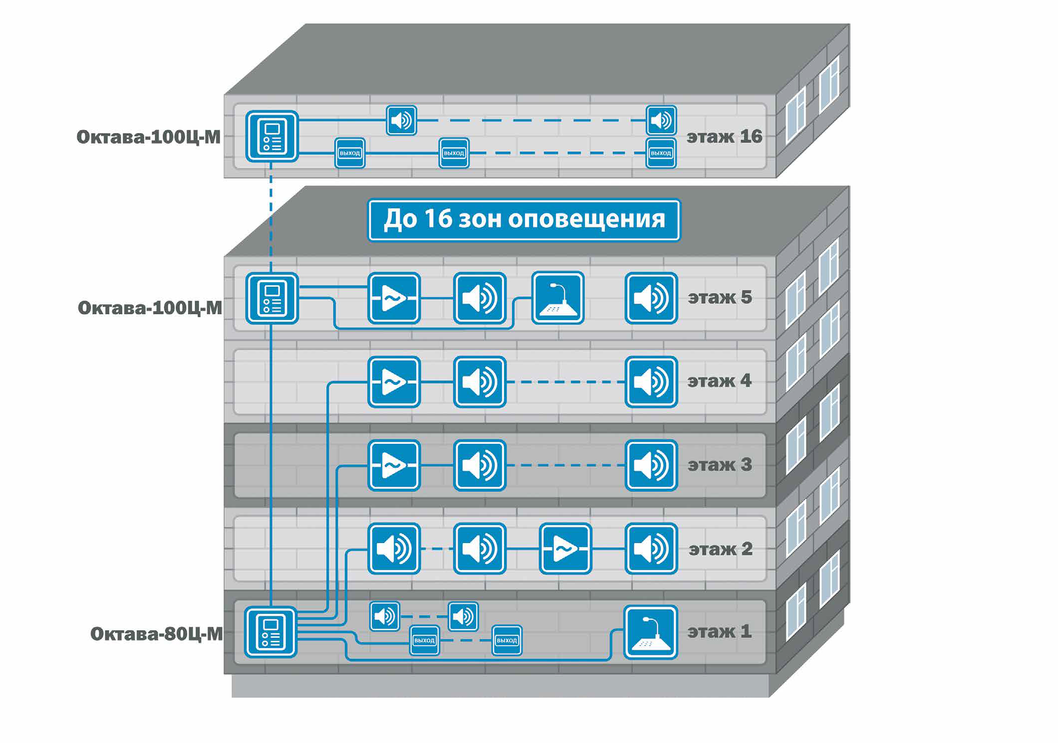 Система «Октава-М» позволяет строить как простые, так и сложные системы пожарного оповещения: