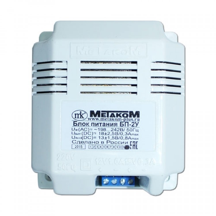 Блок питания МЕТАКОМ БП-2У предназначен для питания домофонных систем и дополнительного оборудования производства «Метаком». Мощность нагрузки не должна превышать 16,5 Вт. Выходное напряжение блока питания не стабилизированное. Питание блока осуществляется от сетипеременного тока напряжением 220 В частотой 50 Гц. Блок питания может эксплуатироваться в интервале температур от -30 до +40 °С при относительной влажности воздуха не более 95%. Блок питания имеет защиту от короткого замыкания по входу, и защиту от перегрузки по каждому из выходов.